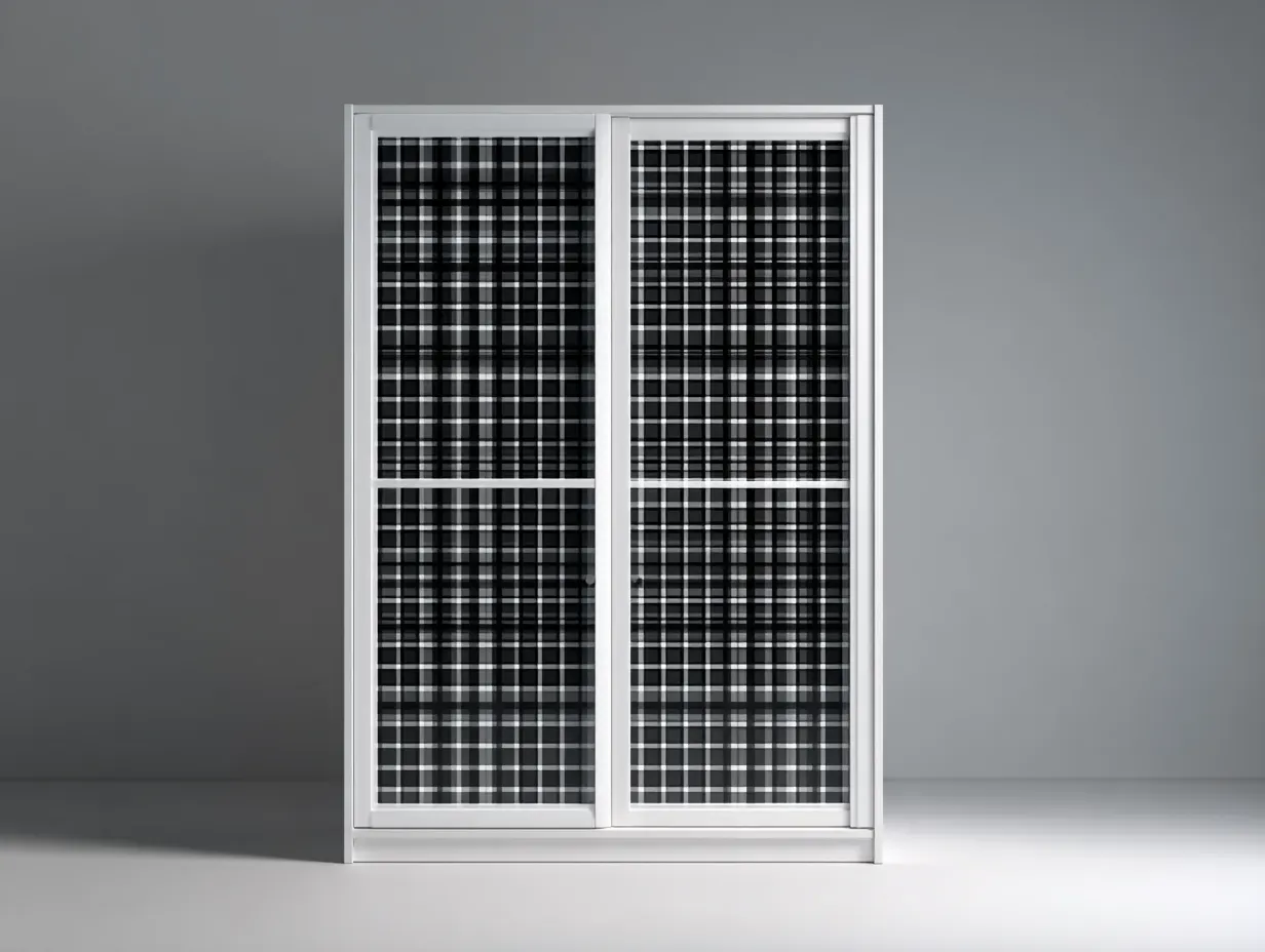 La struttura è realizzata in legno con pannelli frontali in vetro, rifinita in tonalità bianca con motivi grafici in nero e grigio. Le superfici risultano uniformi e resistenti, mentre la lavorazione accurata garantisce stabilità e affidabilità nel tempo.